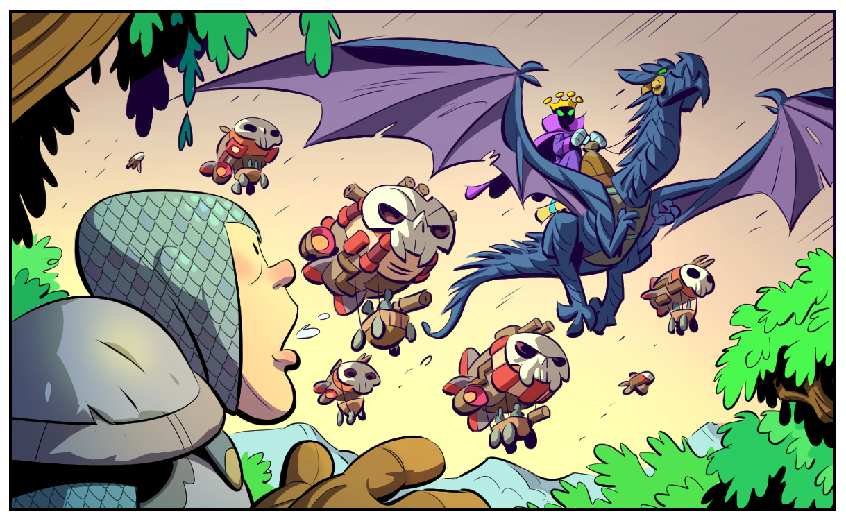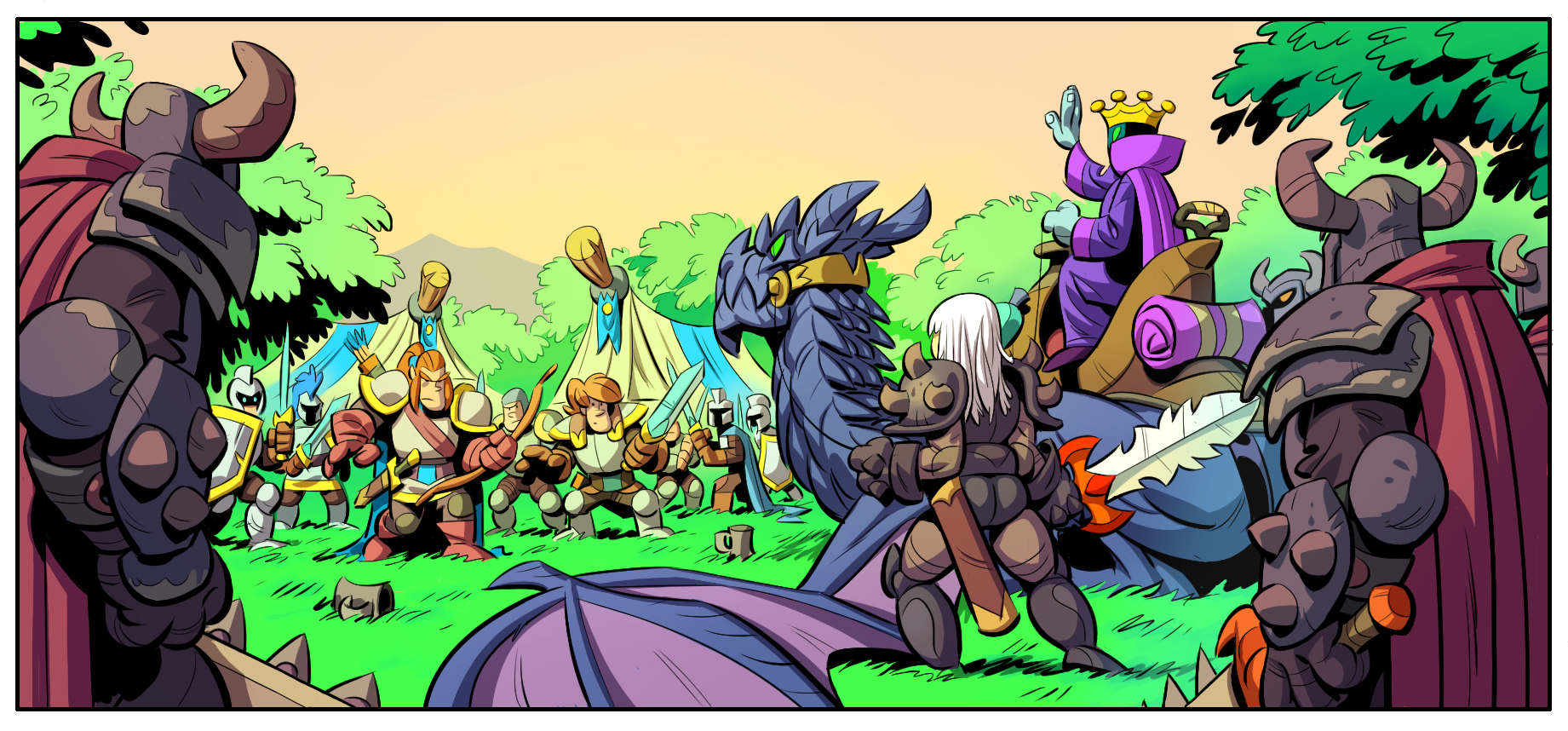 A rider with a golden crown and purple cape sat on the dragon's back, leaving no doubt as to his identity. Their arrival was followed by a fleet of War Zeppelins, their ominous presence casting a shadow over our once-secret camp.